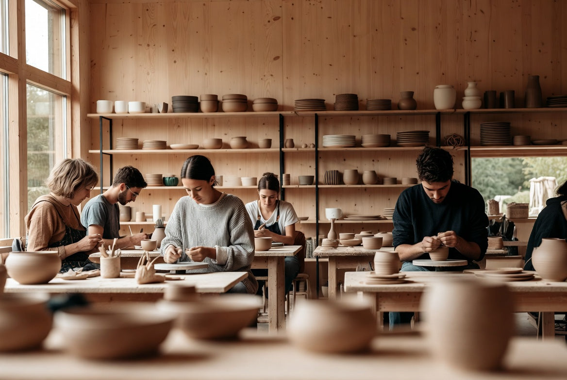 Some days are social and playful — painting with friends, family afternoons, shared tables filled with conversation. Other days are quieter and focused — learning the wheel, refining a form, spending time with the material.