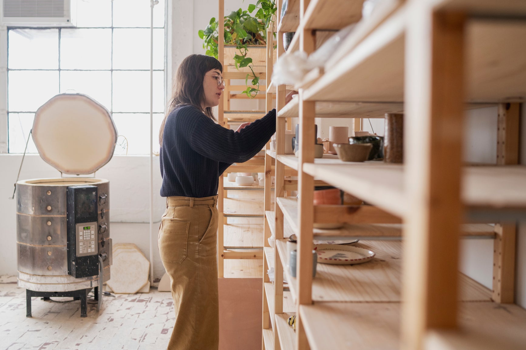 Members have access to shared work-in-progress shelving for pieces currently in production.